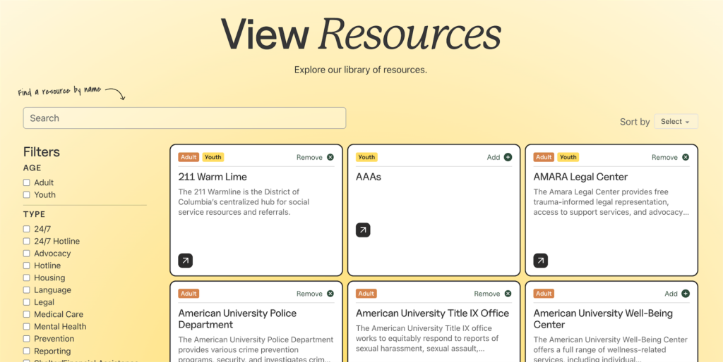 Resources can be found through the site. Click on a resource card to view more info or click the “Add” button to save it to your resources.